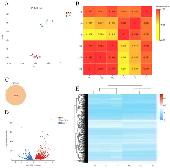 The expression of transcript samples was analyzed using PCA, and the results are shown in Figure 3A. This figure shows that each sample can be clearly distinguished on the score map, and the resets are closely focused, indicating that the transcripts of the two fruits are different. Similar to metabolomics, the CK group was located at the negative end of PC2, while the T group was located at the positive end of PC2. Interestingly, the score map shows that the difference between group CK and group T on PC1 is very weak, indicating that the two samples are similar. Moreover, the sample gene expression correlation between the replicates of each sample was the highest, indicating that the samples had good repeatability (Figure 3B). Differential gene screening was performed with a threshold of p-value < 0.05 and |log2FoldChange| > 2, and a total of 3573 different expression genes (DEGs) were identified, as shown in Figure 3C. Subsequently, we compared the differential expression of genes between normal fruit (CK) and malformed fruit (T) in sweet cherry. The volcanic map showed that 2137 genes were up-regulated and 1400 genes were down-regulated in 3573 DEGs (Figure 3D). In addition, hierarchical clustering heat maps of the two kinds of fruits were drawn (Figure 3E), and the changes in expression levels were represented by red, white, or blue gradients, respectively. Red represents a high expression level, and blue represents a low expression level. The results showed that the repeatability of each group was good, and the transcription differences between groups were large.