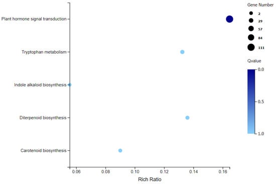 The Kyoto Encyclopedia of Genes and Genomes (KEGG) analysis provides information and further understanding of how sweet cherry regulates its biological functions and the biosynthesis of secondary metabolites at the transcriptome and molecular level. It has been shown that the DEGs are enriched in the 130 KEGG pathways, among which the most significantly enriched pathways were plant hormone signal transduction, tryptophan metabolism, indole alkaloid biosynthesis, diterpenoid biosynthesis, and carotenoid biosynthesis. These pathways are mainly composed of up-regulated DEGs (Figure 4). Among the 130 KEGG pathways, there is 1 pathway related to fruit shape—namely, the diterpenoid biosynthesis pathway (ko00904), with 14 unigenes. The pathways annotated by these DEGs were closely related to the abundance of metabolites of CK and T.