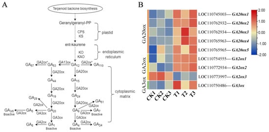 (A) The biosynthetic pathway of gibberellin (GA) in sweet cherry. The GA pathway is based on the study of Chen et al. [4]. (B) Visual heatmap of gene expression of gibberellin-related enzymes in the fruit of sweet cherry. GA2ox*: gibberellin-related synthetase; GA2ox: gibberellin-degrading enzyme.