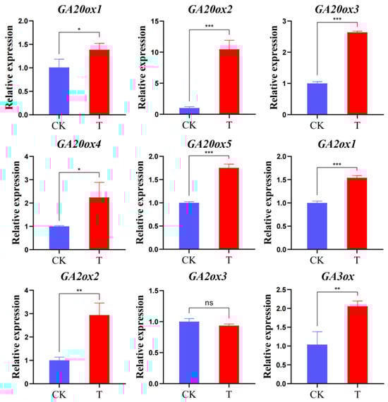 Expression patterns of gibberellin-related enzyme genes in fruit ripening stage using qRT-PCR. Data were normalized against an internal control β-actin, and the expression level at CK was set as 1. Error bars indicate standard deviation, and asterisks indicate significant differences between the CK and T. * p < 0.05, ** p < 0.01, *** p < 0.001, and ns: no significant difference.