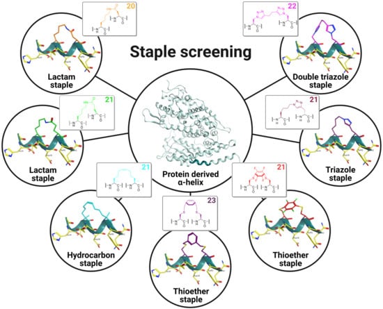 Synthetic low-molecular-weight peptides that mimic bioactive α-helical conformations hold potential for drug design and optimization. Depending on the desired pharmacodynamic (PD) and pharmacokinetic (PK) parameters, two residues facing the same interface might be “stapled” using various cyclization techniques (Figure 1) to compensate for their lack of pharmacological properties (e.g., aqueous versus membrane solubility, metabolic stability, high renal clearance, etc.) [16]. The stapling technique is therefore viewed as a way of simultaneously optimizing both bioactive conformation and PK/PD properties. However, conformation alterations due to changes in the staple can have detrimental effects on peptide efficacy [17].