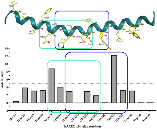 In silico alanine scan (BudeAlaScan a) results for α1-helix (Ser19-Thr52) of hACE2 taken from the crystal structure of SARS-CoV-2 S RBD bound with hACE2 (PDB 6M0J). Residues from hACE2 involved in the SARS-CoV-2 S RBD/hACE2 interface are shown as yellow sticks labeled with three-letter codes. Selected hACE2-derived sequences (Asp30-Asp38) and (His34-Gln42) are outlined in light green and blue, respectively. a BudeAlaScan is an online software (version 1.0) available at https://pragmaticproteindesign.bio.ed.ac.uk/balas/ (accessed on 7 June 2023); it is only applicable to proteins consisting of natural amino acids.