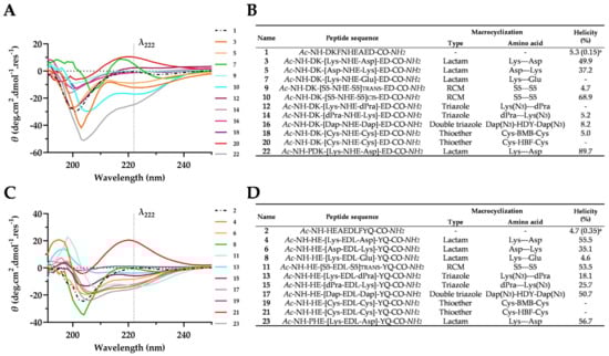 Data generated from Far-UV CD spectra for hACE2-derived peptides measured at a concentration of 100 µM in 10 mM sodium phosphate buffer at pH 7.4 and 25 °C. (A) Far-UV CD spectra of hACE2 (Asp30-Asp38)-derived linear and i, i + 4 staple peptides in molar ellipticity per residue. (B) Table listing the derivatives of 1 with a focus on the macrocyclization technique and measure-based calculated helicity (%) via CD. (C) CD spectra of hACE2 (His34-Gln42)-derived linear and i, i + 4 staple peptides in molar ellipticity per residue. (D) Table listing the derivatives of 2 with a focus on the macrocyclization technique and measure-based calculated helicity (%) via CD. HDY 1,5-Hexadiyne; BMB 1,4-Bis(bromomethyl)benzene; HFB hexafluorobenzene. a Predicted helicity (%) using AGADIR online software available at http://agadir.crg.es (accessed on 17 April 2023); it is only applicable to peptides consisting of natural amino acids.