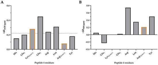We next exploited the chemical shifts of the CαH and NH protons as indicators of secondary structure. We compared the 1H NMR assignments with the characteristic random-coil 1H chemical shifts previously reported in the literature [62]. As expected, all of the CαH protons in peptide 4 were found to be upfield shifted from the random-coil value by −0.22 ppm on average. That finding is indicative of helical conformation throughout the entire peptide (Figure 4). The largest upfield shifts were observed for the amino acids Lys(linker), Glu2, Asp and Leu, which are encompassed by the staple or form the linker themselves. That result is suggestive of a strong helical constraint induced by the lactam bridge.