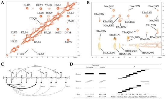 Ideally, 1H two-dimensional NOESY spectra of an α-helical peptide enable the assignment of sequential short-range dNN(i,i+1) and dαN(i,i+1), as well as sequential and medium-range dαN(i,i+3) and dαN(i,i+4). However, only short-range nuclear Overhauser effect (NOE) could be observed. This finding is due to NOE’s low efficacy for such short peptides; the correlation times fall in between the extreme narrowing and spin-diffusion limits (Figure 5).