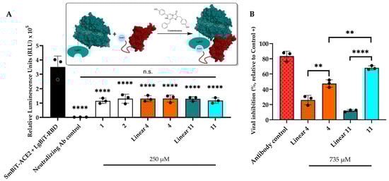 The SARS-CoV-2 Spike RBD/hACE2 inhibition assessment involving a bioluminescence-based bioreporter assay and a pseudovirus-based entry inhibition assay. (A) Split-luciferase bioreporter assay demonstrating the disruptor capacity of peptides 1, 2, linear 4, 4, linear 11 and 11. Asterisks indicate a statistically significant difference between the RLUs measured for SmBiT-ACE2 + LgBiT-RBD and the neutralizing Ab control or an individual peptide. (B) Antiviral activity of peptides linear 4, 4, linear 11 and 11 was assessed using a SARS-CoV-2 pseudovirus carrying a fluorescent reporter gene and HEK-293T-hACE2 cells transfected with TMPRSS2. The fluorescence data (RFUs) were converted into percentages via normalization with the infection-free control (Dulbecco’s Eagle Medium; DMEM) set as 0%; we furthermore considered that the pseudovirus-only samples represented maximum infection (100%) using GraphPad Prism software (version 9.3.1). Both experiments were repeated in triplicate three times, and the data are expressed as means ± standard error of the mean (SEM) (error bars). The means of more than two groups were compared using one-way ANOVA with Tukey’s multiple comparison correction. For all analyses, **** p < 0.0001; ** 0.0017 p 0.0025; n.s., not significant.