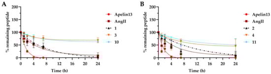 We determined resistance to proteolysis for linear 1 and 2, lactam 3 and 4 and hydrocarbon 10 and 11 staple peptides by incubating the compounds for 24 h in rat plasma at 37 °C and recording degradation using UPLC-MS (Figure 7). As a reference control, we used a well-characterized 13-mer peptide known as Apelin-13 [67], which possesses a short in vitro half-life (t1/2). Additionally, Angiotensin II (AngII), an upregulator of hACE2 expression in human bronchial cells [68], is an important factor in coronavirus disease (COVID-19) lung infections and has a half-life of 4.2 h in rat plasma. Linear peptides 1 and 2 both exhibited levels of degradation similar to those of 8-amino acid-long AngII.