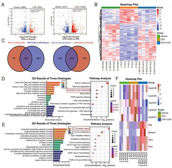 CUR restores hepatic transcriptomic changes induced by OTA exposure in mice. (A) Volcano plot of DEGs between different groups. (B) Heatmap of cluster analysis based on expression levels of DEGs. (C) Venn diagram of DEGs between different groups. (D) GO terms and KEGG pathways of DEGs upregulated in the OTA group and downregulated in the OTA+CUR group. (E) GO terms and KEGG pathways of DEGs downregulated in the OTA group and upregulated in the OTA+CUR group. (F) Heatmap of DEGs within Arachidonic acid metabolism and Circadian rhythm signaling pathways. Vehicle: 5 mL/kg b.w. corn oil; OTA: 0.5 mg/kg b.w. OTA; OTA+CUR: 0.5 mg/kg b.w. OTA+100 mg/kg b.w. CUR.