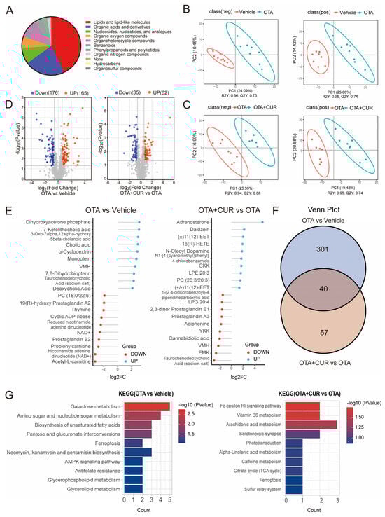 CUR alleviates OTA-induced hepatic metabolic disorders in mice. (A) Classification of the identified metabolites. (B) OPLS-DA for differential metabolites between vehicle and OTA in positive and negative ion mode. (C) OPLS-DA for differential metabolites between OTA and OTA+CUR in positive and negative ion mode. (D) Volcano plot of differential metabolites between different groups. (E) Top 20 differential metabolites between different groups. (F) Venn diagram of differential metabolites between different groups. (G) KEGG pathways enriched by differential metabolites. Vehicle: 5 mL/kg b.w. corn oil; OTA: 0.5 mg/kg b.w. OTA; OTA+CUR: 0.5 mg/kg b.w. OTA+100 mg/kg b.w. CUR.