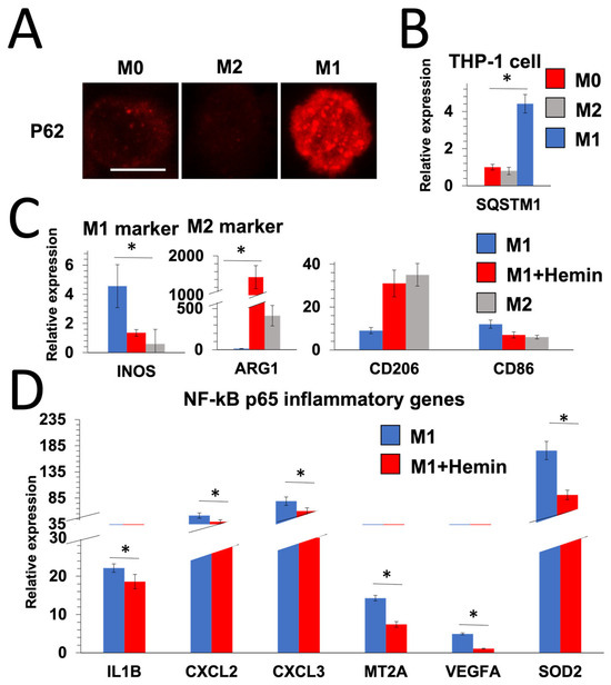 Autophagy induction in M1 macrophages reduce inflammation. Bar = 10 μm. (A) Representative 3D images of p62 immunostaining in M0, M1, and M2 macrophages. p62 was evaluated in the presence of bafilomycin, a lysosomal degradation inhibitor. (B–D) Levels of expression of SQSTM1, M1, and M2 macrophage markers and NF-kB p65 inflammatory genes in M0, M1, and M2 THP1 cells following hemin treatment (25 µM) (autophagy activator) (n = 3) (* p-value < 0.05, one-way ANOVA).