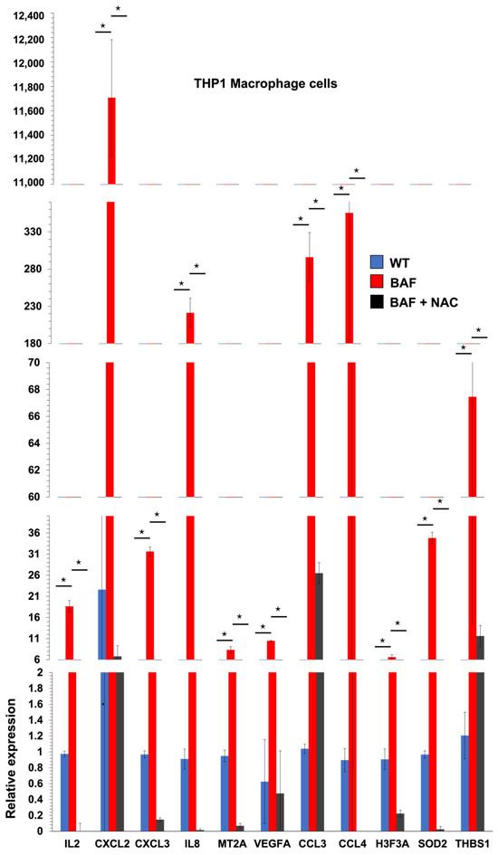 Autophagy dysfunction drives THP1 macrophage cell inflammation in an oxidative-stress-dependent manner: Levels of expression of NF-kB p65 inflammatory genes in undifferentiated THP1 cells (n = 3) after treatment with bafilomycin (100 nM) and NAC (25 mM) for 72 h. All genes were significantly upregulated upon bafilomycin treatment (* p-value < 0.05, one-way ANOVA).