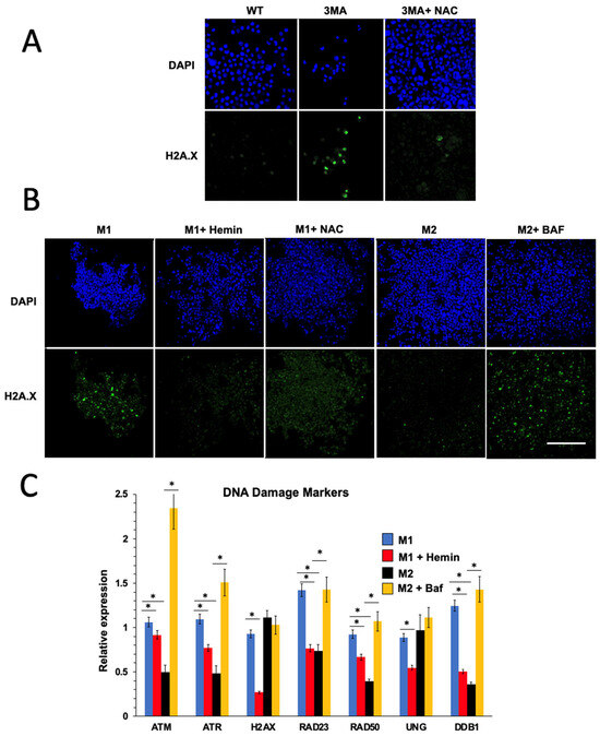 Autophagy deficiency and M1 macrophages induce DNA damage. (A) H2A.X immunostaining of undifferentiated THP1 cells after 24 h of treatment with 3MA (2.5 mM) and NAC (25 mM). Bar = 100 µm. H2A.X immunostaining (B) and QPCR (C) of M1 and M2 THP1 macrophages. During M1 polarization, cells were treated with hemin (25 μM), and during M2 polarization, cells were treated with bafilomycin (100 nM). Bar = 200 µm. (n = 6) (* p-value < 0.05, one-way ANOVA).