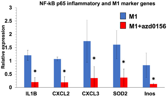 ATM inhibition alleviates the M1 phenotype and inflammation. QPCR results showing levels of expression of NF-kB p65 inflammatory and M1 marker genes in M1 THP1 cells (n = 3) after being treated with ATM inhibitor azd0156 during M1 polarization. All genes marked by asterisk were significantly upregulated upon azd0156 (p-value < 0.05, t-test).