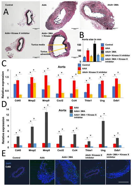 The autophagy–ATM pathway regulates AAA development in a CaCl2 AAA mouse model. (A) Representative images of EVG staining (Elastica van Gieson staining) of the control group, CaCl2-induced AAA mouse model, and AAA mouse model with the administration of ATM inhibitor azd0156 and/or autophagy inhibitor 3MA. (B) Size of aorta in mm in the five groups. (p-value < 0.05, t-test). (C,D) QPCR results showing levels of expression of leukocytic marker Cd45, matrix metalloproteinases Mmp2 and Mmp9, inflammatory genes Cxcl2, Ccl4, and Thbs1, and DNA-damage-related genes Ung and Ddb1 in the five groups. Asterisks indicate a statistically significant (p-value < 0.05, t-test). (E) Representative images of Cd68 immunostaining of isolated aorta between the five groups. Bar = 200 μm.