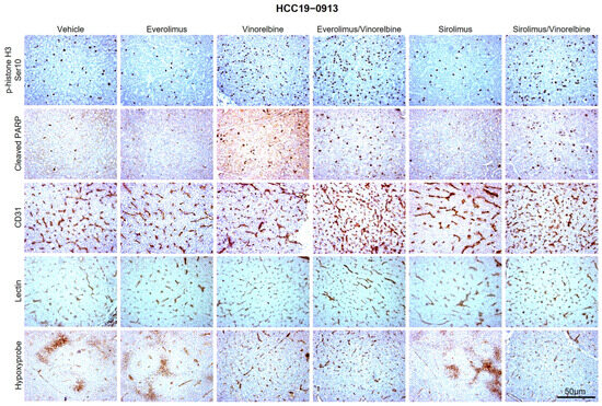 We then assessed the effects of the treatments on the tumor blood vessels, blood-vessel normalization, tumor hypoxia, tumor proliferation, and apoptosis. When compared with tumors treated with either the vehicle or everolimus monotherapy, the tumors treated with vinorelbine or everolimus/vinorelbine—particularly in the HCC19–0913, HCC13–0109, and HCC13–0212 PDX models—exhibited a two- to five-fold increase in the number of p-histone H3 Ser10-positive cells (Figure 2 and Supplementary Figures S5, S6 and S11–S13). However, when compared with the treatment with the vinorelbine monotherapy, the addition of everolimus had varying effects, leading to either no significant changes (in HCC19–0913, HCC13–0212, and HCC13–0109; Figure 2 and Supplementary Figures S5, S6 and S11–S13) or a significant reduction (in HCC25–0705A; Supplementary Figures S5 and S12) in the percentage of p-histone H3 Ser10-positive cells.
