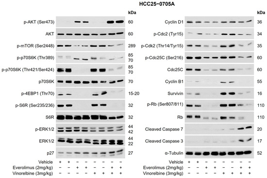 To gain a deeper understanding of the mechanism(s) by which vinorelbine/mTOR inhibitors exert their antitumor activity in HCC PDX models, a western blot analysis was conducted. Figure 3 illustrates the results of the western blot analysis conducted on the HCC25–0705A model after treatment with vinorelbine, everolimus, or everolimus/vinorelbine. Compared with the vehicle, the vinorelbine treatment increased the levels of various proteins, including p-p70S6K (Thr389), p-p70S6K (Thr421/Ser424), p-4EBP1 (Thr70), p-Cdc2 (Tyr15), p-Cdk2 (Thr14/Tyr15), p-Rb (Ser807/811), Cyclin B1, p27, survivin, and cleaved caspase 3/7. In contrast, the everolimus treatment led to significant reductions in the levels of p-mTOR (Ser2448), p-p70S6K (Thr421/Ser424), p-Cdc2 (Tyr15), p-Cdk2 (Thr14/Tyr15), p-Rb (Ser807/811), Rb, Cyclin B1, Cyclin D1, Cdc25, p-Cdc25C (Ser216), and survivin. Additionally, the everolimus treatment led to increases in the levels of p-AKT (Ser473) and p27 but undetectable levels of p-4EBP1 (Thr70) and p-S6R (Ser235/236) when compared with those of the vehicle treatment. It is noteworthy that when everolimus was combined with vinorelbine, the combination abolished the vinorelbine-induced upregulations of p-p70S6K (Thr389), p-p70S6K (Thr421/Ser424), p-4EBP1 (Thr70), p-S6R (Ser235/236), p-Cdc2 (Tyr15), p-Cdk2 (Thr14/Tyr15), Cdc25C, p-Rb (Ser807/811), Rb, Cyclin B1, and survivin. However, this combination led to significant increases in the levels of p-AKT (Ser473), p27, cleaved caspase 3, and cleaved caspase 7. Additionally, modest reductions in the levels of p-ERK1/2 and Cyclin D1 were observed in the everolimus/vinorelbine treatment group.