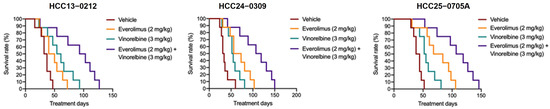 Effects of everolimus, vinorelbine, and everolimus/vinorelbine on the survival of HCC13–0212, HCC24–0309, and HCC25–0705A orthotopic models. HCC orthotopic models were established as previously described in [34]. These models were treated with everolimus, vinorelbine, or everolimus/vinorelbine for the indicated days, as described in Section 4. Each treatment group consisted of 10 mice. Treatments commenced when the tumor sizes reached approximately 100–150 mm3. Kaplan–Meier survival curves are presented. Everolimus/vinorelbine significantly improved the OS of the mice (p < 0.01; log-rank test).