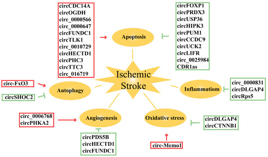 CircRNAs are tissue-specific and expressed within the central nervous system. Existing studies have shown that circRNAs are closely related to neurological impairment and may become a new target and direction for ischemic stroke. The role of circRNAs in ischemic stroke is presented in the following aspects: apoptosis, autophagy, inflammation, oxidative stress, and angiogenesis (Table 1).