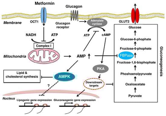 Organic cation transporter OCT1 is considered responsible for the transport of metformin into hepatocytes, resulting in the inhibition of the mitochondrial respiratory chain (complex I), but this is achieved through a currently unknown mechanism. The deficit in energy production so generated is balanced by reducing gluconeogenesis in the liver. It must be stressed that this hypothesis is not well related to the chemical parameters of metformin [,], which indicate its low lipophilicity. Consequently, the rapid passive diffusion of metformin through cell membranes seems to be considered unfavored. However, OCT1 and OCT3 have been suggested as possible transporters of metformin in the liver [].