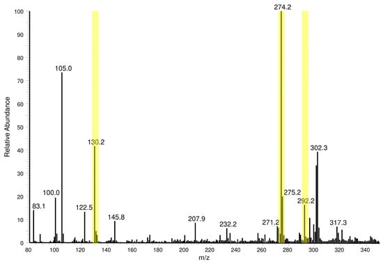 ESI-MS spectrum of working solution 1, highlighting the interesting cluster ion signals at m/z 130, m/z 274 and m/z 292.