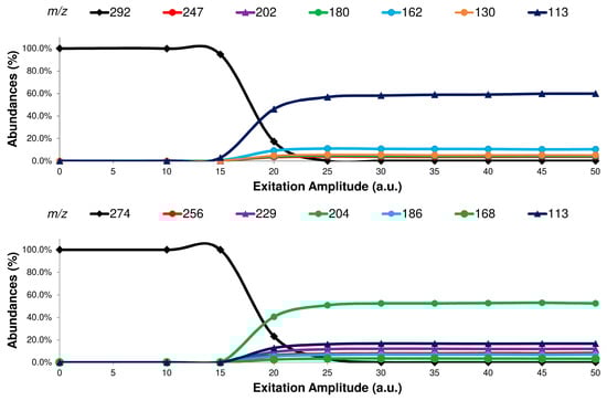 Collision breakdown curves of [M+H]+ of metformose (m/z 292) (above) and DHmetformose (m/z 274) (below) at different excitation amplitudes.