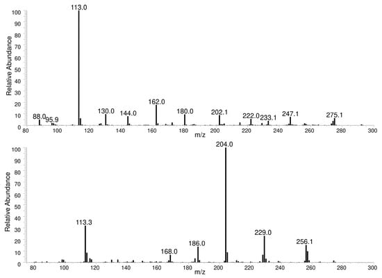 MS/MS spectra at the ExAmax of metformose (above) and DHmetformose (below).