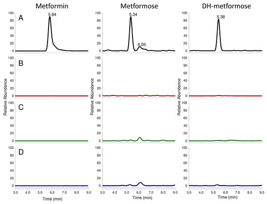 The most important question in this study is: does the reaction between glucose and metformin occur in physiological conditions (temperature, pH, etc. …)? To investigate this aspect, urine samples from three untreated subjects (samples named B, C and D) (and one patient treated (sample A) with oral doses of metformin (1 + 1 g) were analyzed by 2D HPLC-MS/MS, monitoring the fragmentation products characteristic of metformin, metformose and DHmetformose. The application of the 2D HPLC technique was necessary to facilitate the analysis of the analytes in the human urine samples. In fact, it is known that human urine has high quantities of inorganic salts, which, if they coelute with the analytes in ESI conditions, can affect their ionization (matrix effects). Then, by injecting the sample into the loading column (first LC dimension), all the compounds that did not interact with the stationary phase were eliminated (e.g., inorganic salts), while the adsorbed analytes, after the loading time, were eluted in the counter-flow and analyzed from the analytical column (second LC dimension). The chromatographic profiles, related to the most abundant product ions in the MS/MS spectrum of each analyte, are reported in Figure 6.