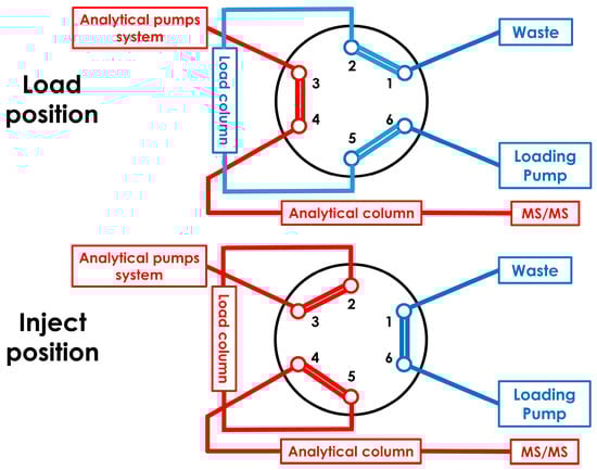 The chromatographic system employed for the analysis of the samples involved the use of three pumps and a six-port valve to perform the 2D-HPLC technique. The system was assembled around the six-port valve, which switched from the first to the second separation dimension. This technique led to the injection of the sample, in isocratic conditions, into the loading column (first dimension) via the loading pump; then, after swapping the position of the valve, the retained sample components were eluted in a counter-flow manner by analytical pumps and transferred into the chromatographic column (second dimension). Following this, the loading column received the sample and held the components of interest while the others were eluted to waste. These characteristics recall the solid-phase extraction (SPE) procedure but with the advantage of being performed on-line between the autosampler and the chromatographic column. In the second chromatographic dimension, the chromatographic column was coupled with the mass spectrometer and led to the separation of the retained components through a gradient elution carried out by the analytical pump system. The 2D-HPLC procedure described above is depicted in Figure 7.