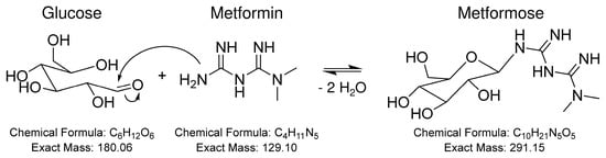Considering the high polarity and the strong reactivity of metformin, a question may arise weather is the original structure the active form at the cellular level, or are other related compounds, resulting from its reaction with some circulating molecular species, responsible for either pharmacokinetic and/or pharmacodynamics characteristics. In this context, it can be considered that metformin can react with circulating glucose. In fact, the reactivity between glucose and the amino groups of the lysine residues present in protein chains is well described by the Maillard reaction pattern []. As discussed by Gokhale et al. [], these reactions are important for evaluating both the drug’s stability and the synthesis of related compounds. Taking into account that the formation of glycosylamines in solution, the first step of the Maillard reaction, involves a decrease in the concentration of the drug, this is significant from the point of view of its activity. On the other hand, related compounds can be active, thus modulating the pharmacokinetics and/or pharmacodynamics of the drug.