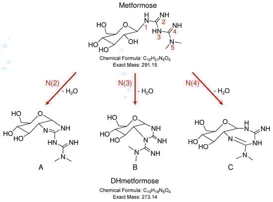 Proposed reaction pathways due to water loss from metformose, indicating the hydroxyl group on the quaternary carbon atom and the different NH groups, leading to DHmetformose of different structures (A, B and C).