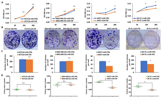 - Zhang, G.J.; Zhou, H.; Xiao, H.X.; Li, Y.; Zhou, T. MiR-378 is an independent prognostic factor and inhibits cell growth and invasion in colorectal cancer. BMC Cancer 2014, 14, 109. [Google Scholar] [CrossRef] [PubMed]