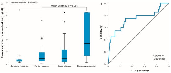 Serum calretinin concentration differed in MM patients with different treatment outcomes. The highest calretinin concentrations were observed in patients with disease progression after chemotherapy and the lowest were observed in patients who responded completely to chemotherapy (p = 0.006, Figure 1a). Calretinin concentration was statistically significantly higher in patients who progressed after the completion of chemotherapy compared to others (1.68 (0.58–4.20) ng/mL versus 0.45 (0.21–1.07) ng/mL, p = 0.001). Calretinin concentration at diagnosis was a good predictor of disease progression (area under the curve 0.74 (0.60–0.88); p = 0.001) (Figure 1b). At a cutoff of 0.89 ng/mL, the sensitivity for predicting disease progression was 0.750 and the specificity was 0.714.