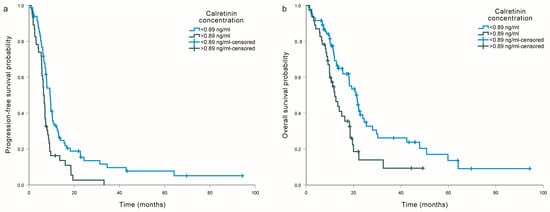 Association of serum calretinin concentration with (a) progression-free survival and (b) overall survival from the beginning of chemotherapy in malignant mesothelioma patients treated with cisplatin-based chemotherapy.