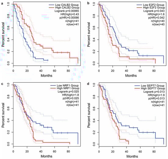 The association of gene expression with the survival of MM patients showed that disease-free survival (DFS) was only statistically significantly affected by SEPTIN7 (HR = 1.9, p = 0.03), while no significant differences were observed for CALB2 (HR = 0.80, p = 0.42), E2F2 (HR = 1.6, p = 0.099), and NRF1 (HR = 1.7, p = 0.065). On the other hand, all four genes were significantly associated with OS of MM patients: patients with high CALB2 expression had longer survival than patients with low CALB2 expression (HR = 0.43, p < 0.001, Figure 3a), while patients with higher E2F2 (HR = 1.6, p = 0.042, Figure 3b), NRF1 (HR = 1.8, p = 0.025, Figure 3c), or SEPTIN7 (HR = 1.9, p = 0.013, Figure 3d) expression had shorter OS.