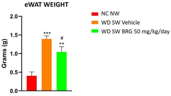 Effect of Bergacyn® on eWAT in WD SW-fed mice. The weight of eWAT increased significantly in mice fed with a high-fat diet and treated with the vehicle compared to mice fed an NC NW diet. Bergacyn® (BRG) (50 mg/kg/day) treatment in WD SW-fed mice determined a significant eWAT loss. NC NW group (red bar; n = 10); WD SW vehicle group (orange bar; n = 10); WD SW 50 mg/kg/day of Bergacyn® (BRG) group (green bar; n = 10). Data are expressed as the mean ± SEM. ***: p < 0.001 vs. NC NW; **: p < 0.01 vs. NC NW; #: p < 0.05 vs. WD SW.