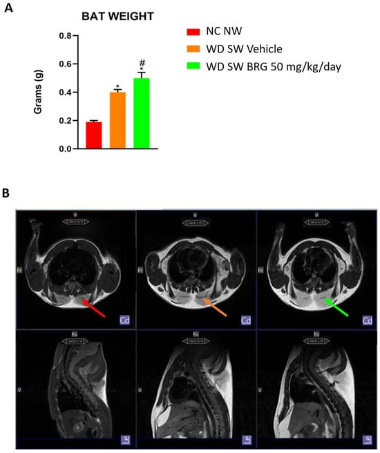 Effect of Bergacyn® on BAT tissue. (A) The BAT weight increased in mice fed a WD SW diet and treated with Bergacyn® (BRG) compared to mice fed an NC NW diet. Treatment with 50 mg/kg/day of Bergacyn® (BRG) increased even more the weight of the fat pad. The weight of WAT was similar in obese mice treated with vehicle or Bergacyn® (BRG), and this was higher compared to the NC NW animals. NC NW group (red; n = 10); WD SW vehicle group (orange; n = 10); WD SW 50 mg/kg/day of Bergacyn® (BRG) group (green; n = 10). (B) Representative in vivo axial (up) and sagittal (down) 7T magnetic resonance images (T2-weighted) of the mouse brown adipose tissue (BAT) of the three different experimental groups (see the arrows in red, orange, and green, respectively). NC NW group; WD SW vehicle group; and WD SW 50 mg/kg/day of Bergacyn® (BRG) group (from left to right). Data are expressed as the mean ± SEM. * p < 0.05 vs. NC NW; # p < 0.05 vs. WD SW vehicle.