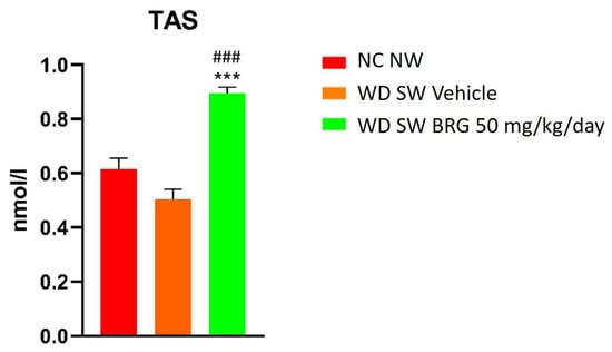 Effects of Bergacyn® on serum total antioxidant status (TAS). TAS was assessed at the end of the study in the serum of the NC NW (red bar; n = 10), WD SW vehicle (orange bar; n = 10), and WD SW Bergacyn® (BRG) 50 mg/kg/day (green bar; n = 10) mice. Data are expressed as the mean ± SEM. ***: p < 0.001 vs. NC NW; ###: p < 0.001 vs. WD SW.