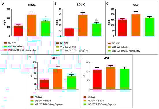Effects of Bergacyn® on serum biochemical parameters. Different analytes, (A) CHOL, (B) LDL-C, (C) GLU, (D) ALT, (E) AST, were assessed at the end of the study in the serum of NC NW (red bar; n = 10), WD SW (orange bar; n = 10), and WD SW Bergacyn® (BRG) 50 mg/kg/day (green bar; n = 10) mice. (A): Serum cholesterol levels Data are expressed as the mean ± SEM. ***: p < 0.001 vs. NC NW; **: p < 0.01 vs. NC NW; ##: p < 0.01 vs. WD SW; #: p < 0.05 vs. WD SW. CHOL: cholesterol; LDL-C: low-density lipoprotein cholesterol; GLU: glucose; ALT: alanine aminotransferase; AST: aspartate aminotransferase.
