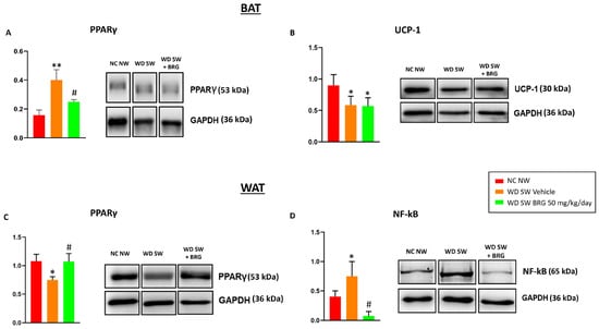 Expression of PPARγ, UCP-1, and NF-kB in adipose tissue. (A) The PPARγ expression in BAT was reduced in the WD SW group treated with 50 mg/kg/day of Bergacyn® (BRG) compared to the WD SW vehicle group. Furthermore, in the WD SW group, the expression of PPARγ increased significantly compared to the NC NW group. (B) The expression of UCP-1 in BAT was significantly reduced both in the WD SW group and in the WD SW group treated with Bergacyn® (BRG) compared to the NC NW group. (C) The expression of PPARγ in WAT was increased in the WD SW group treated with 50 mg/kg/day of Bergacyn® (BRG) compared to the WD SW vehicle group, restoring levels similar to those of the NC NW group. Furthermore, in the WD SW group, the expression of PPARγ decreased significantly compared to the NC NW group. (D) The expression in the WAT of NF-kB was significantly increased in the WD SW animals treated with the vehicle and reduced by the treatment with Bergacyn® (BRG). NC NW group (red bar; n = 10); WD SW vehicle group (orange bar; n = 10); WD SW BRG group (green bar; n = 10). Results are expressed as mean ± SEM * p < 0.05 vs. NC NW; **: p < 0.01 vs. NC NW; # p < 0.05 vs. WD SW vehicle. PPARγ: peroxisome proliferator-activated receptor gamma; UCP-1: uncoupling protein 1; NF-kB: Nuclear factor kappa-light-chain-enhancer of activated B cells.