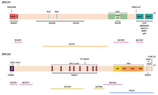 BRCA1 and BRCA2 structure. BReast CAncer 1 (BRCA1) is an 1863 amino acids (aa) protein constituted of a Really Interesting New Gene (RING) domain, a serin cluster domain (SCD) and two BRCA1 C-Terminal (BRCT) domains. Its localization is supported by one nuclear export sequence (NES) and two nuclear localization sequences (NLSs). It interacts with BRCA1-associated RING domain protein 1 (BARD1) through its RING finger motifs, RAD50, RAD51, Partner and Localizer of BRCA2 (PALB2) through a coiled coil domain within SCD and various phosphorylated proteins involved in DNA repair by homologous recombination through its BRCT domains. BRCA2 is a 3418 aa protein composed of a Transcriptional Activation Domain (TAD), eight BRC motifs and a DNA binding domain (DBD) composed of one helical domain (HD) and three oligonucleotide-binding folds (OB1-3). Its nuclear localization is supported by three NLSs. Its phosphorylation is supported by various kinases such as cyclin-dependent kinase 1 (CDK1), polo-like kinase 1 (PLK1) and checkpoint kinases 1 and 2 (CHK1/2). BRCA2 mainly binds to PALB2 and RAD51. Pathogenic founder variants are harbored in both genes (185delAG, 5382insC and 6174delT) and more specifically present in breast cancer cluster regions (BCCR) and ovarian cluster regions (OCCR). BRCA2 also harbors a prostate cancer cluster region (PCCR).