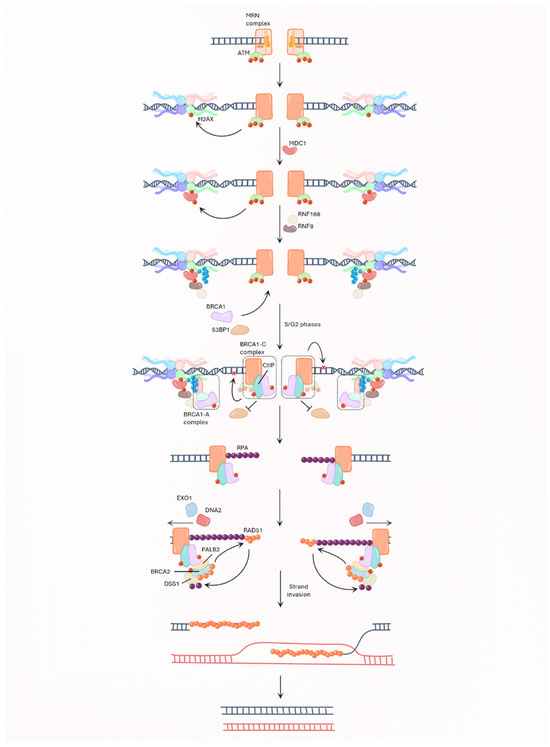 DSBs are detected by ATM and MRN complex, which is composed of the DNA repair proteins MRE11 and RAD50, and Nibrin (NBS1) [36]. ATM activation is mediated through the recruitment of the MRN at the DSBs site, autophosphorylation and acetylation [37]. ATM then phosphorylates the H2A histone family member X (H2AX) to trigger the reparation machinery and the Mediator of DNA damage Checkpoint Protein 1 (MDC1) to amplify the DDR [38]. Follows the recruitment of E3-ubiquitine ligases, such as RING Finger proteins 8 and 168 (RNF8/168), which leads to a ubiquitin signaling cascade on phosphorylated H2AX (γ-H2AX) [39,40]. This signal recruits the tumor suppressor p53-binding protein 1 (53BP1) and BRCA1 to the DSB site by MDC1 and receptor-associated protein 80 (RAP80), respectively. Depending on the cell cycle, a switch occurs between 53BP1 and BRCA1 localization at DSBs site. Cells in the G1 phase will be repaired by NHEJ due to the recruitment of 53BP1 after histone modifications, of which H2AX phosphorylation. However, in the S phase, CtIP is phosphorylated by CDK, which induces its interaction with BRCA1 and the MRN complex. The formation of this complex, named the BRCA1-C complex, triggers the removal of 53BP1 at DSB sites and the repair of DNA DSBs by HR [41]. BRCA1 is phosphorylated during the S phase by ATM/ATR and CHK1/2 to allow its nuclear import to DNA DSBs. BRCA1 forms a macrocomplex (BRCA1-A complex) with ABRAXAS and RAP80, to maintain DDR signaling and the activation of the G2/M checkpoint [35,42]. The BRCA1-C complex also initiates the end resection of DNA by generating single strand DNA (ssDNA) [43]. Whilst end resection does not depend on BRCA1, the protein facilitates the process [42]. Extensive end resection is supported by exonuclease 1 (EXO1) and DNA2 to allow Replication Protein A (RPA) loading on ssDNA. Once phosphorylated by CHK2, BRCA1 forms a complex with PALB2/BRCA2 to replace RPA with RAD51. DNA damage also triggers BRCA2 phosphorylation by CHK1/2 to enhance its interaction with RAD51. Besides its RAD51 binding sites, BRCA2 binds to DSS1, a protein that mimics ssDNA, so RPA will bind to DSS1 and RAD51 will be loaded on free ssDNA [43] (Figure 2). DNA repair by HR is completed once strand invasion on the homolog chromatid occurs.