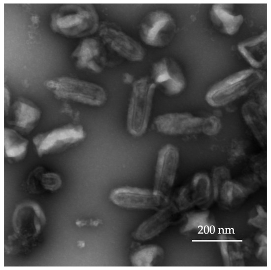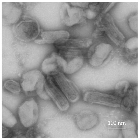 The amplification of rVSV-GFP in BHK-21 cells involved transduction (infection) with post-transfection-conditioned culture media containing assembled virus particles. Three rounds of virus amplification were carried out for the described experiments; however, the number of production steps usually depends on the amount of virus required for in vitro or in vivo experiments. The virus titer was assessed by CPE in BHK-21 cells 72 h post-infection. The rVSV-GFP titer (TCID50/mL) was calculated according to the Reed–Muench method and was 3 × 109 TCID50 in a 30 mL volume. For intratumoral injections at the desired dose, no further purification of rVSV-GFP was carried out, and the virus preparation was diluted to the final dose (1 × 106 and 1 × 108 TCID) in a 50 µL volume. The rVSV-GFP preparation was analyzed using transmission electron microscopy (TEM) (Figure 2). Bullet-shaped virions with an interior striated pattern and lipid bilayer, consistent with the features of an intact VSV virus, were observed.