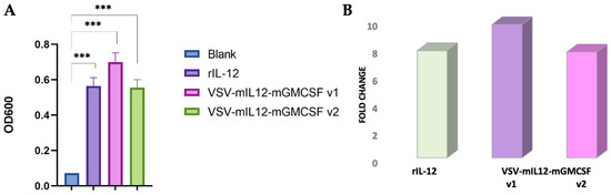 To confirm the activity of IL-12, which was expected to be present in rVSV-mIL12-mGMCSF supernatants, the HEK-Blue™ IL-12 reporter line, stably expressing IL-12 receptor and signaling pathway genes as well as the STAT4 transcription factor-inducible SEAP (secreted alkaline phosphatase) reporter gene, was used. As the SEAP gene is under the control of a minimal promoter, its expression only occurs in response to IL-12 stimulation, which triggers a signaling cascade leading to STAT-4 activation followed by SEAP production. The optical density (OD600) values of the samples containing rVSV-mIL12-mGMCSF supernatants from two amplification volumes were comparable (v2) or exceeded (v1) those of the positive control rIL-12 used at 10 ng/mL (Figure 4A) and were 10 (v1) and 8 (v2) times higher compared to the blank negative control (Figure 4B).