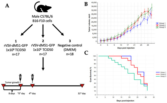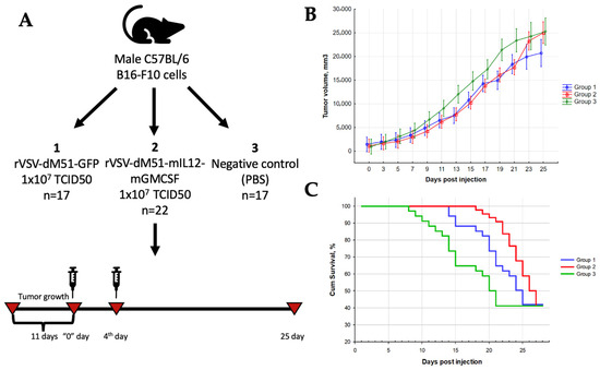 rVSV-mIL12-mGMCSF prolongs the survival of mice with murine melanoma. (A) Study design. (B) Partially inhibited tumor growth was observed in groups 1 and 2 mice compared to group 3 mice (max 37.4% and 36.9%, respectively, on days 13 and 9). The TGII in group 2 remained statistically significant until day 16 of the study (Mann–Whitney U-test, p < 0.05). There were statistically significant differences in tumor volumes between groups 1 and 3 for 12 days during the study (Mann–Whitney U-test, p < 0.05). (C). The increase in the median survival of mice in the treatment groups.