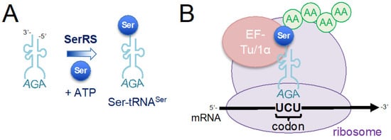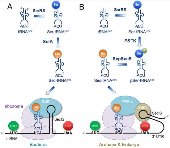 - Carlson, B.A.; Xu, X.M.; Kryukov, G.V.; Rao, M.; Berry, M.J.; Gladyshev, V.N.; Hatfield, D.L. Identification and characterization of phosphoseryl-tRNA[Ser]Sec kinase. Proc. Natl. Acad. Sci. USA 2004, 101, 12848–12853. [Google Scholar] [CrossRef] [PubMed]