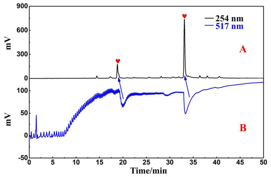 In a Reprosil-Pur C18 AQ analytical column, the crude sample and four collected fractions were analyzed simultaneously. The analytical diagram (Figure 1B–F) shows that the main ingredients of R. himalense were effectively enriched in Fr2 and Fr3, while trace ingredients were mostly enriched in Fr1 and Fr4. Subsequently, the antioxidants in Fr4 were detected with the online HPLC-DPPH activity screening system. Figure S1B shows a schematic diagram of this system. As illustrated in Figure 2A,B, the retention time between 15 and 35 min displayed two significant negative peaks at 517 nm, thereby implying that the two peaks at 254 nm had free radical scavenging activity (marked with red shapes). These two active peaks had to be further purified and separated to obtain high-purity free radical inhibitors.