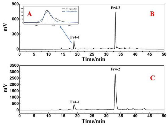 Fr4 was separated in a Reprosil-Pur C18 AQ preparative column using an injection volume of 0.5 mL and a flow rate of 19 mL/min. The analytical chromatogram and preparative chromatogram results of Fr4 are shown in Figure 3B,C. After repeating the purification method six times, two active fractions were finally collected and labeled as Fr4-1 (104.2 mg) and Fr4-2 (377.2 mg). The remaining inactive chromatographic peaks were directly discarded.