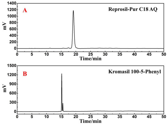 Analysis chromatogram of Fr4-1 in Reprosil-Pur AQ analytical column (A) and Kromasil 100-5-Phenyl analytical column (B).