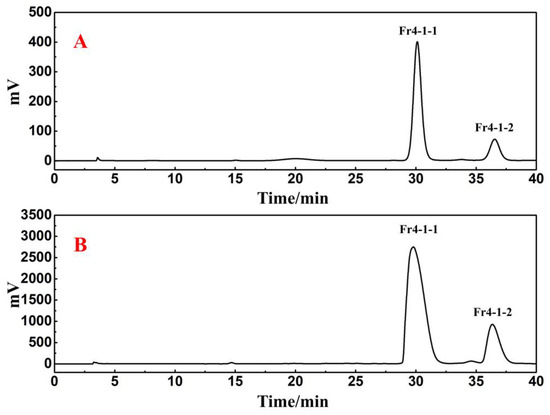 For Fr4-1, 104.2 mg was dissolved in 1.0 mL of methanol, and the sample solution was passed through a 0.45 μm filter preceding the study. Figure 4B shows two visible separated chromatographic peaks of Fr4-1 in the Kromasil 100-5-phenyl analytical column. However, in the case of the Reprosil Pur C18 AQ analytical column, the results still show a main chromatographic peak (Figure 4A). Based on the above findings, Fr4-1 was further separated using a Kromasil 100-5-phenyl preparative column. After further optimizing the conditions for the chromatographic separation of Fr4-1, two fractions labeled Fr4-1-1 (43.4 mg) and Fr4-1-2 (19.5 mg) were obtained via 10 preparative separation cycles. Figure 5 shows the analytical and preparative comparison chromatograms of Fr4-1. It can be seen that the retention times of these two target peaks in the preparation diagram (Figure 5B) of Fr4-1 were basically the same as that in the analysis diagram (Figure 5A), which did not affect the recovery of high-purity antioxidants.