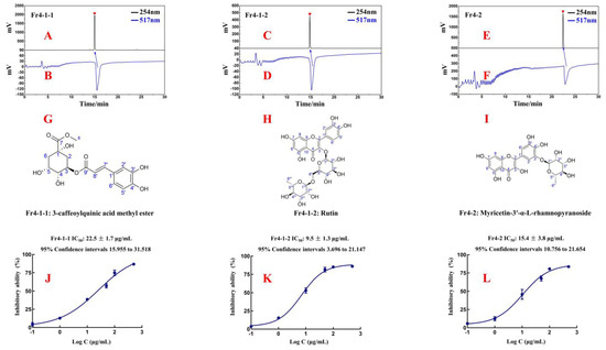 Purity and free-radical-inhibiting activity of Fr4-1-1 (A,B), Fr4-1-2 (C,D), and Fr4-2 (E,F) in ReproSil-Pur C18 AQ analytical column. Chemical structures of Fr4-1-1 (G), Fr4-1-2 (H), and Fr4-2 (I). DPPH inhibitory activities and IC50 values of Fr4-1-1 (J), Fr4-1-2 (K), and Fr4-2 (L) at different concentrations.